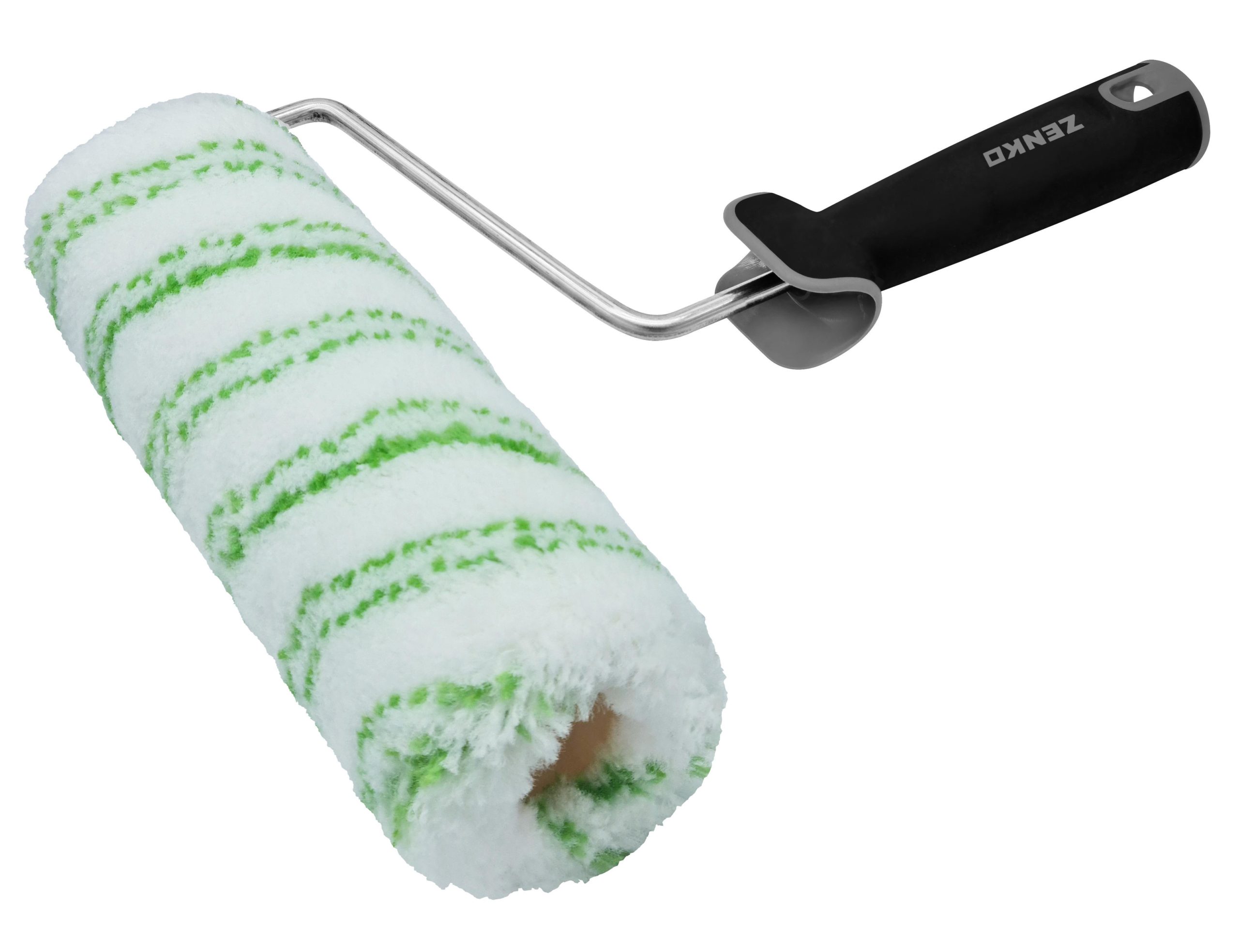 Rodillo fabricado con fibras medias poliamida teflonadas de 12 mm., blanco con raya doble verde , polipropileno 220 mm., mango ergonómico bi componente, acero 7 mm., abierto, ABS.